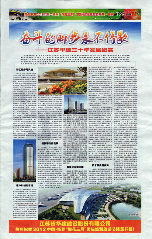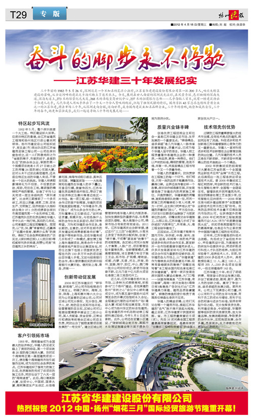 《揚(yáng)州晚報(bào)》專版刊發(fā)公司三十周年宣傳文章 時(shí)間:2012-04-19 6016 4月18日,《揚(yáng)州晚報(bào)》T29版刊發(fā)專版文章《奮斗的腳步永不停歇——江蘇華建三十年發(fā)展紀(jì)實(shí)》,從公司起步、市場(chǎng)開拓、創(chuàng)新發(fā)展、質(zhì)量與科技等各個(gè)層面,介紹了公司三十年的奮斗歷程、綜合實(shí)力和發(fā)展業(yè)績(jī)。