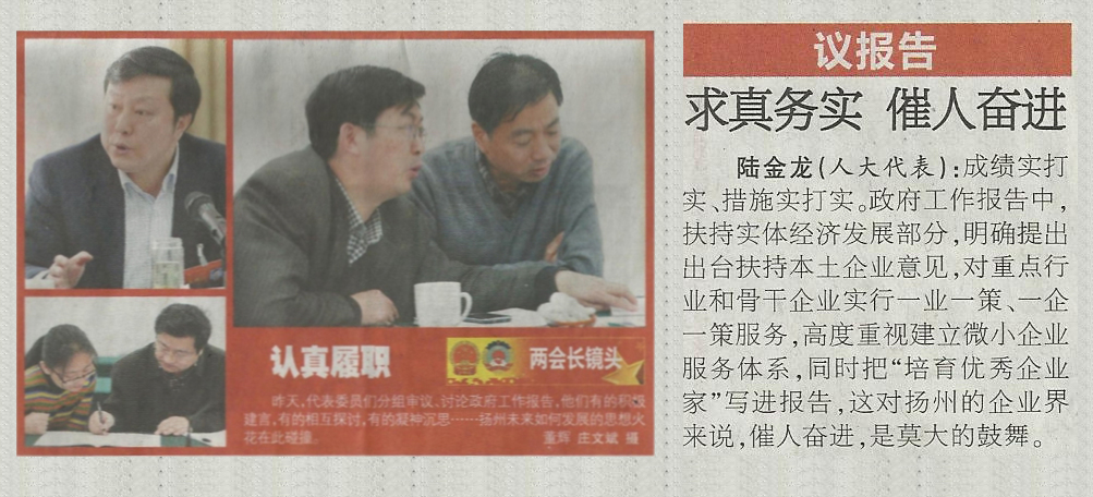元月7日的《揚州日報》焦點新聞欄目報道了我公司董事長陸金龍參加揚州市七屆人大二次會議的有關情況。本次人代會6日上午在揚州會議中心隆重開幕,作為市人大代表,陸董事長在會上認真參與對朱民陽市長代表政府所作工作報告的討論,并圍繞“六個基本”抓發(fā)展、合力推進“三個揚州”和世界名城建設、加快建設更高水平小康社會積極建言獻策。《揚州日報》在人大代表“議報告”中第一個刊登了陸董事長的發(fā)言:“成績實打實、措施實打實。政府工作報告中,扶持實體經(jīng)濟發(fā)展部分,明確提出出臺扶持本土企業(yè)意見,對重點行業(yè)和骨干企業(yè)實行一業(yè)一策、一企一策服務,高度重視建立微小企業(yè)服務體系,同時把‘培育優(yōu)秀企業(yè)家’寫進報告,這對揚州的企業(yè)界來說,催人奮進,是莫大的鼓舞。”