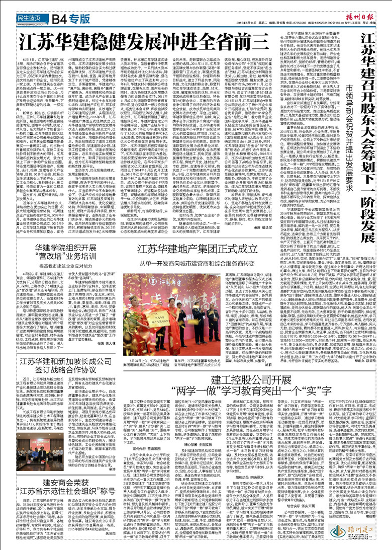 今日《揚州日報》刊登專版文章報道華建進入全省前三有關消息 時間:2016-06-14 4125 今天出版的《揚州日報》B4“揚州建工”專版刊登了江蘇華建穩健發展沖進全省前三、華建股東大會、華建地產集團成立、“兩學一做”學習教育等相關文章,歡迎關注。
