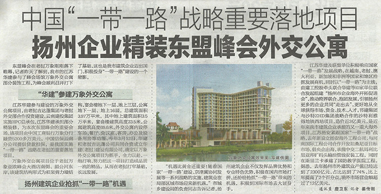 9月12日《揚(yáng)州晚報(bào)》刊載華建東盟峰會(huì)外交公寓項(xiàng)目消息 時(shí)間:2016-09-12 3850 近日,東盟峰會(huì)在老撾萬象剛剛落下帷幕。9月12日,《揚(yáng)州晚報(bào)》A7版刊載題為《中國“一帶一路”戰(zhàn)略重要落地項(xiàng)目 揚(yáng)州企業(yè)精裝東盟峰會(huì)外交公寓》的文章,詳細(xì)報(bào)道華建積極踐行國家“一帶一路”戰(zhàn)略,承建東盟峰會(huì)場(chǎng)館萬象外交公寓精裝修工程的有關(guān)情況。