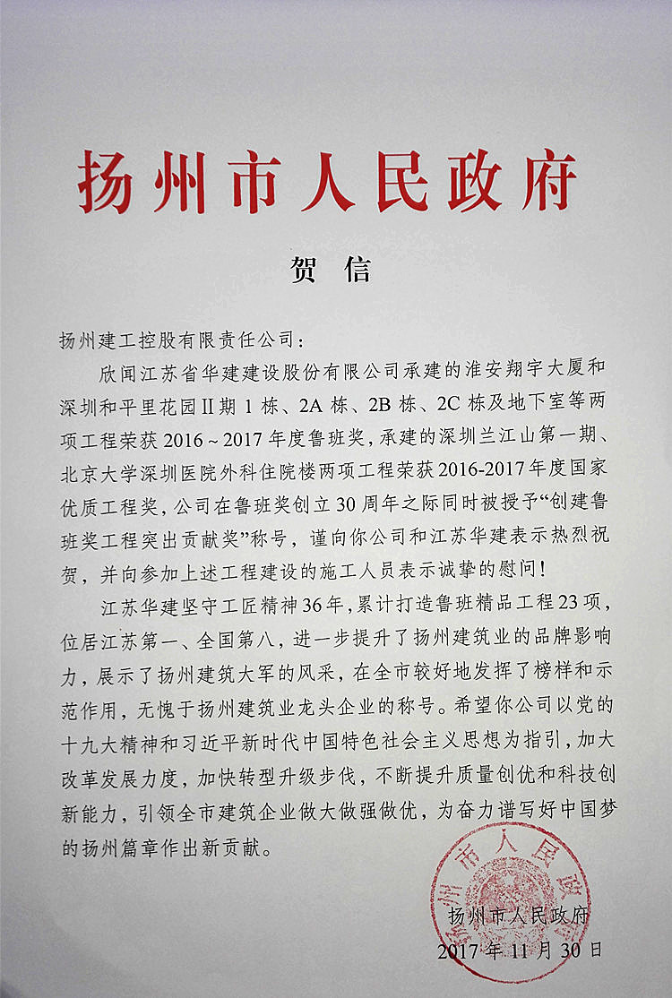 11月30日,揚(yáng)州市人民政府專門發(fā)來(lái)賀信,對(duì)公司承建的淮安翔宇大廈、深圳和平里花園Ⅱ期1棟 、2A棟、2B棟、2C棟及地下室兩工程榮獲2016-2017年度魯班獎(jiǎng);深圳蘭江山第一期、北京大學(xué)深圳醫(yī)院外科住院樓兩工程榮獲2016-2017年度國(guó)家優(yōu)質(zhì)工程獎(jiǎng),以及在魯班獎(jiǎng)創(chuàng)立30周年大會(huì)上被授予“創(chuàng)建魯班獎(jiǎng)工程突出貢獻(xiàn)獎(jiǎng)”稱號(hào),表示熱烈祝賀,并向參加上述工程建設(shè)的施工人員表示誠(chéng)摯的慰問(wèn)。