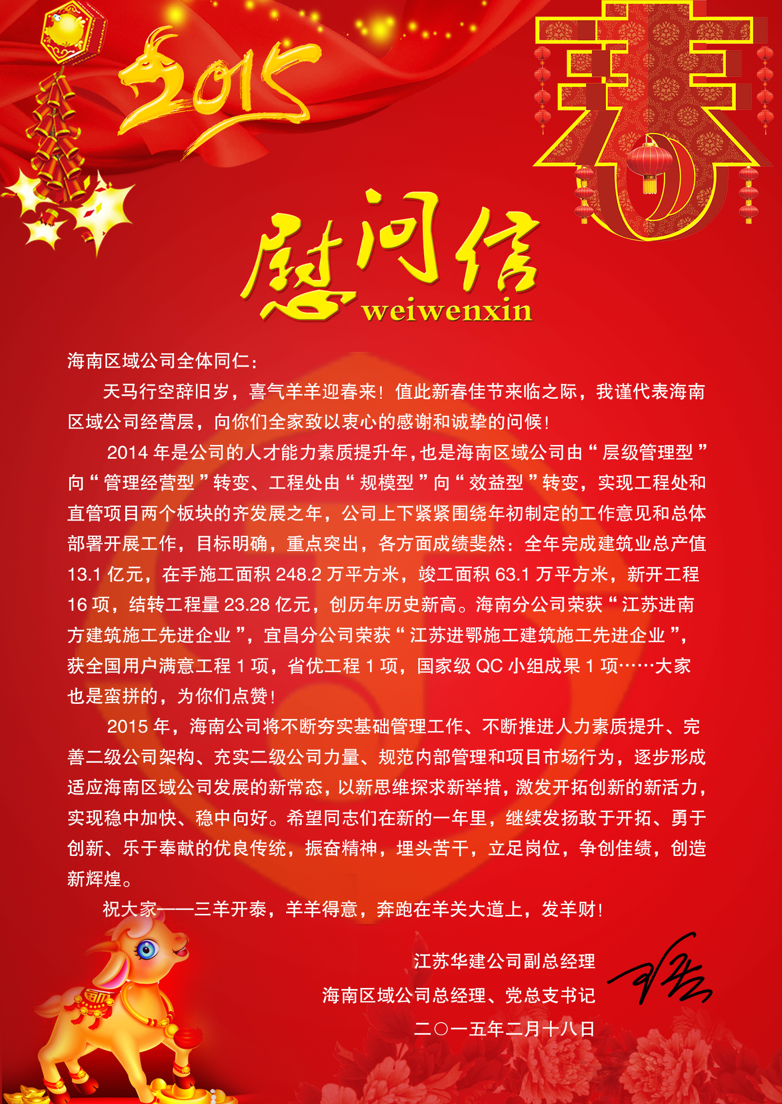 公司副總、海南區域公司總經理王宏致全體員工新春慰問信