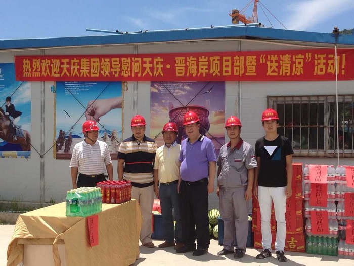 千里送清涼——天慶集團董事長韓慶慰問我司一線職工 時間:2015-08-05 4189 8月4日中午,烈日當空,驕陽似火。甘肅天慶房地產(chǎn)集團有限公司董事長韓慶一行不遠千里來到廣東珠海,頂著烈日,冒著酷暑,在項目負責人陳建的陪同下,慰問我司承建的“天慶·晉海岸”項目一線施工人員,給工人們送來了西瓜、礦泉水、王老吉等飲品和深情問候,讓廣大一線職工在炎炎烈日下感受到陣陣清涼。