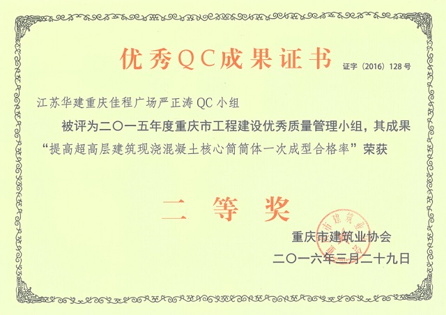 公司新增2項省級QC成果 時間:2016-04-06 4251 近日,重慶市建筑業協會發文表彰了一批優秀QC成果,公司重慶佳程廣場項目嚴正濤、沈正祥QC小組被評為2015年度重慶市工程建設優秀質量管理小組,其成果“提高超高層建筑現澆混凝土核心筒筒體一次成型合格率”、“提高鋼筋機械套筒連接合格率”等均榮獲二等獎。