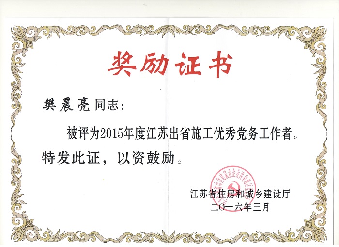 重慶分公司被表彰為“2015年度江蘇出省施工先進企業(yè)” 時間:2016-04-20 3026 近日,重慶分公司被江蘇省住房和城鄉(xiāng)建設廳表彰為“2015年度江蘇出省施工先進企業(yè)”,重慶分公司總經(jīng)理嚴正濤榮獲“2015年度江蘇出省施工優(yōu)秀企業(yè)經(jīng)理”稱號,樊晨亮被評為“2015年度出省施工優(yōu)秀黨務工作者”。