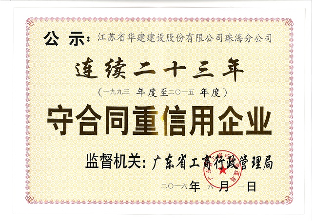 連續(xù)二十三年獲得“守合同重信用企業(yè)”的榮譽稱號,是政府主管部門和行業(yè)的認可和鼓勵,這份榮譽將鞭策珠海公司將誠實守信、合法經(jīng)營的企業(yè)理念一如既往地灌輸?shù)矫恳粋€工程建設(shè)中去,持續(xù)做好企業(yè)誠信體系建設(shè),保持自身競爭優(yōu)勢,樹立守法履約的良好施工企業(yè)形象。