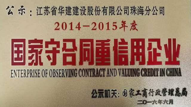 公司榮獲國家級“守合同重信用”企業(yè)稱號 時間:2016-08-02 2908 日前,國家工商行政管理總局向社會公示2014-2015年度“守合同重信用”企業(yè)名單,珠海公司榮獲國家級“守合同重信用”企業(yè)稱號。 珠海市共計13家企業(yè)被國家工商總局表彰為2014-2015年度“守合同重信用”企業(yè),其中新上榜企業(yè)4家。榮獲該稱號充分展現(xiàn)出江蘇華建在珠海市場守法履約的良好施工企業(yè)形象。