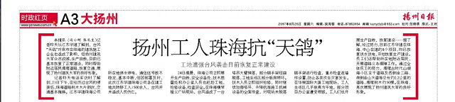 8月23日,珠海遭遇了53年來(lái)最強(qiáng)臺(tái)風(fēng)“天鴿”,全市受災(zāi)嚴(yán)重。臺(tái)風(fēng)過(guò)后,珠海公司第一時(shí)間迅速組織復(fù)產(chǎn)自救工作,并主動(dòng)聯(lián)系珠海有關(guān)部門,迅速組織志愿者及重型工程車輛投入到社會(huì)道路的清理中去。在這場(chǎng)抗風(fēng)救災(zāi)的戰(zhàn)斗中,珠海公司共疏通社區(qū)道路5條、市政道路3 條,清走倒伏大樹200余棵,運(yùn)送災(zāi)后垃圾 20車次。《揚(yáng)州日?qǐng)?bào)》A3版顯著位置對(duì)公司抗風(fēng)救災(zāi)活動(dòng)進(jìn)行了報(bào)道,點(diǎn)評(píng)江蘇華建珠海公司“眾志成城,生產(chǎn)自救,展現(xiàn)了揚(yáng)州建筑大軍的良好形象”。