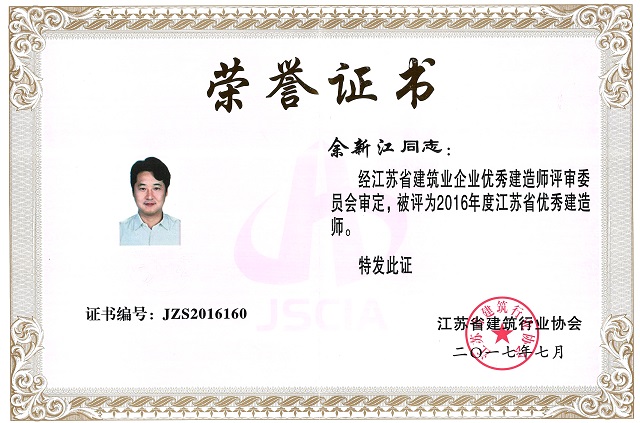公司1位同志被授予“江蘇省優秀建造師”榮譽稱號 時間:2017-12-12 4017 日前,江蘇省建筑行業協會下發了《關于2016年度江蘇省建筑業優秀建造師的決定》,公司余新江同志位列榜單,榮獲表彰,被授予“江蘇省優秀建造師”榮譽稱號。