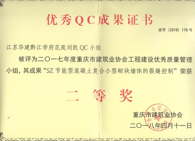 近日,重慶市建筑業(yè)協(xié)會(huì)發(fā)文表彰了一批優(yōu)秀QC成果,江蘇華建黔江學(xué)府花苑劉凱QC小組被評(píng)為2017年度重慶市工程建設(shè)優(yōu)秀質(zhì)量管理小組,其成果“SZ節(jié)能型混凝土復(fù)合小型砌塊墻體的裂縫控制”榮獲二等獎(jiǎng)。