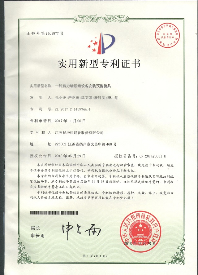 近日,從國家知識(shí)產(chǎn)權(quán)局傳來喜訊,公司申請(qǐng)的《一種剪力墻嵌墻設(shè)備安裝預(yù)留模具》獲得實(shí)用新型專...