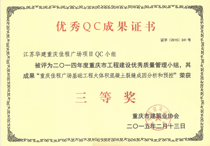 近日,重慶市建筑業協會發文表彰了一批優秀QC成果,公司重慶佳程廣場項目QC小組被評為201...
