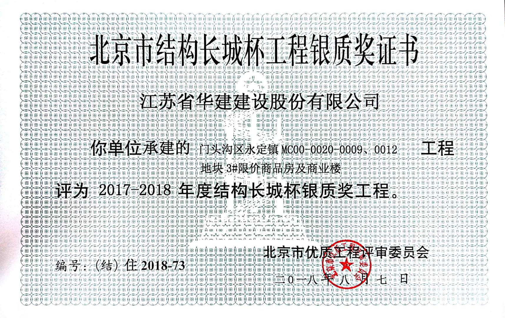 近日,北京市工程建設(shè)質(zhì)量管理協(xié)會(huì)公布了2017-2018年度北京市結(jié)構(gòu)長(zhǎng)城杯工程及獲獎(jiǎng)單位,由北京公司承建的門頭溝區(qū)永定鎮(zhèn)MC00-0020-0009、0012地塊3#限價(jià)商品房及商業(yè)樓項(xiàng)目獲得結(jié)構(gòu)長(zhǎng)城杯銀質(zhì)獎(jiǎng)。