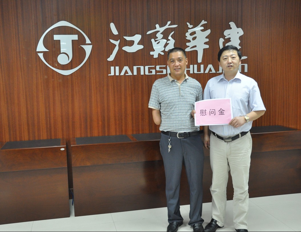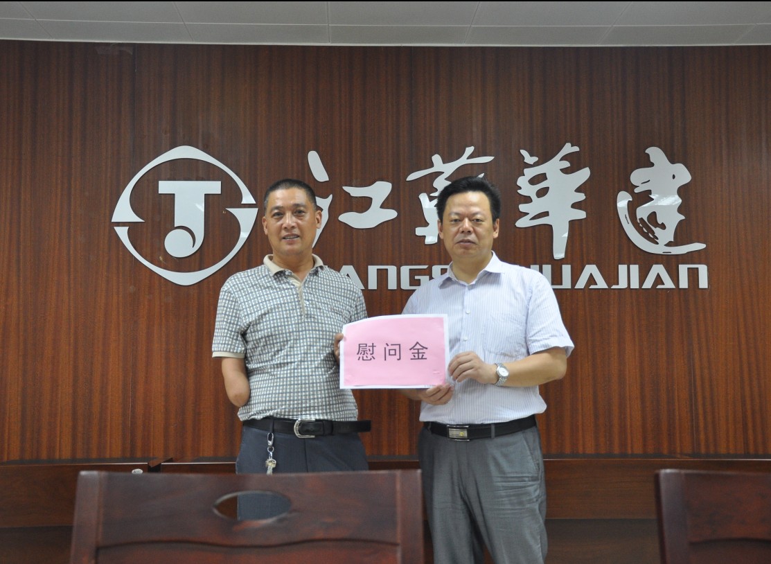 夏日炎炎,酷暑難耐。江蘇華建副總經(jīng)理、惠州分公司總經(jīng)理華恒榮率分公司工會(huì)親切慰問(wèn)了在惠州分公司第九工程處工作的傷殘員工居家應(yīng)(居家應(yīng)90年代在寶應(yīng)工作期間,不慎失去了右膀,被定為三級(jí)傷殘)。慰問(wèn)中,華總詳細(xì)了解他的生活、工作情況,并向他發(fā)放慰問(wèn)金,同時(shí)要求九處在工作、生活上給予一定的關(guān)心。居家應(yīng)感謝組織對(duì)他的關(guān)心,表示身殘志不殘,更加積極努力的工作,不辜負(fù)組織的期望?;葜莘止究倳?huì)計(jì)師高正金,分公司工會(huì)主席王健陪同慰問(wèn)。