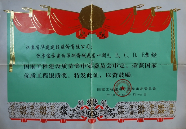 該工程先后榮獲2000年度深圳市雙優(yōu)文明工程稱號(hào)(A、B、C棟工程)、2001年度深圳市雙優(yōu)文明工程稱號(hào)(D、E棟工程);2003年度江蘇省揚(yáng)州市“瓊花杯”及江蘇省省外“揚(yáng)子杯”優(yōu)質(zhì)工程獎(jiǎng)(A、B、C棟工程)、2004年度江蘇省揚(yáng)州市“瓊花杯”及江蘇省省外“揚(yáng)子杯”優(yōu)質(zhì)工程獎(jiǎng)(D、E棟工程);2004年度國家優(yōu)質(zhì)工程銀獎(jiǎng);QC小組課題“墻體清水混凝土質(zhì)量控制”獲得江蘇省一等獎(jiǎng)及全國工程建設(shè)優(yōu)秀QC小組獎(jiǎng)。