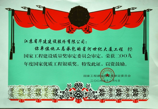 星河世紀大廈 時間:2010-01-19 8320 該工程位于深圳市福田區深南大道南與彩田路西交匯處,是深圳市中心區東門標志性建筑。該工程一裙三塔,32-39層,高173.2米,總建筑面積156680平方米,是集辦公、商業、住宅為一體的綜合樓。 該工程先后榮獲2006年度“深圳市安全生產文明施工優良工地”、2007年度深圳市優質工程“金牛獎”第一名、2007年度廣東省優良樣板工程獎、2007年度江蘇省“揚子杯”省外優質工程獎,2009年12月被評為2009年度國家優質工程銀質獎。