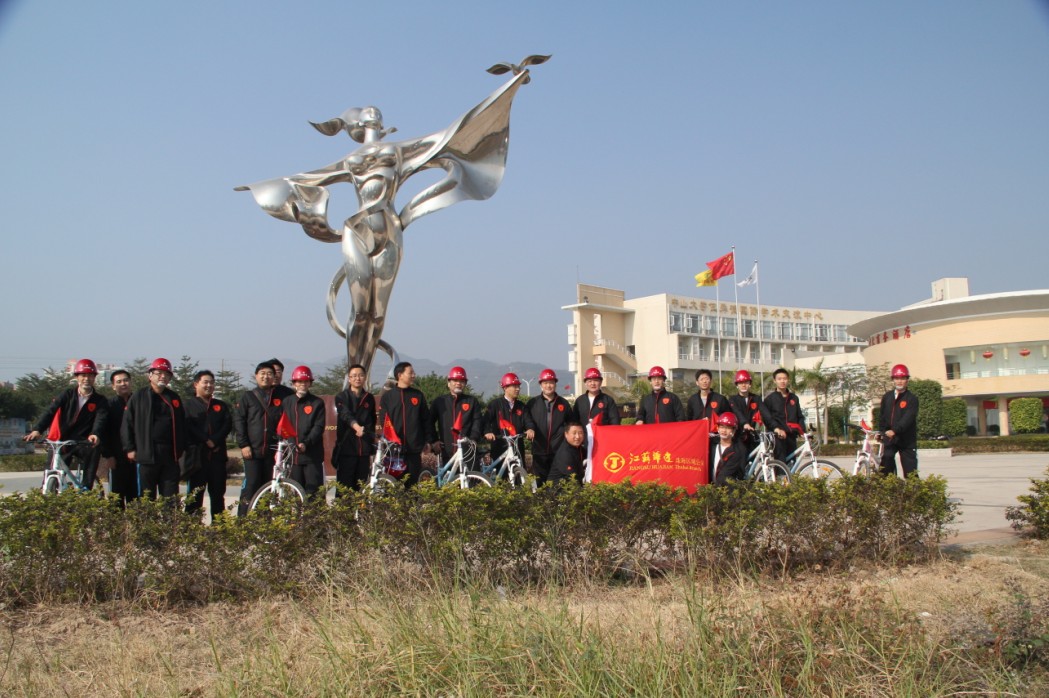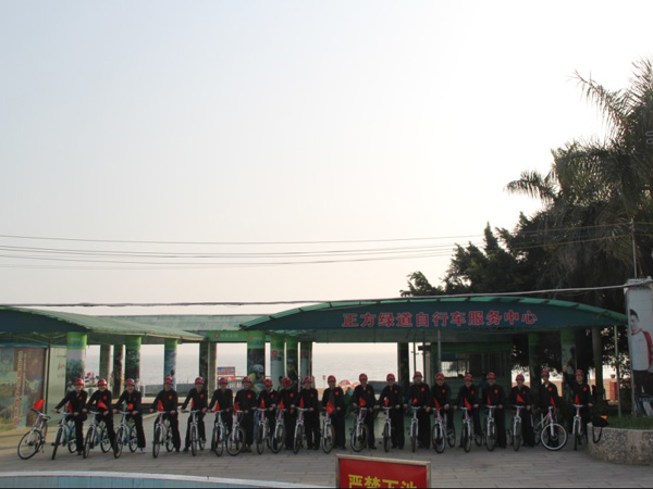 2012年1月1日上午9時(shí),珠海區(qū)域公司全體員工在公司經(jīng)理室的帶領(lǐng)下,統(tǒng)一著裝,頭戴印有江蘇華建標(biāo)識(shí)的安全頭盔,騎著統(tǒng)一插有江蘇華建小紅旗的自行車,沿著珠海海濱綠道開展騎自行車迎新年活動(dòng)。騎行的起點(diǎn)是珠海海濱浴場(chǎng),終點(diǎn)是珠海淇澳島,來回全程56公里。騎行過程中,隊(duì)伍有序安全行進(jìn),引導(dǎo)車上醒目的江蘇華建大旗迎風(fēng)招展,每輛自行車前面的江蘇華建小紅旗也分外引人注目??妵鴺锌偨?jīng)理身先士卒,騎行在隊(duì)伍的最前面,無論是年近6旬的老員工,還是剛工作不久的新員工,個(gè)個(gè)爭(zhēng)先恐后,奮勇向前,江蘇華建這支特殊的“騎兵隊(duì)”在新年的第一天飛行在珠海的海濱綠道上,形成了一道亮麗的風(fēng)景線,引得許多路人和游客紛紛駐足觀望,許多攝影愛好者也紛紛舉起手中的相機(jī)爭(zhēng)相拍照。 這次元旦騎自行車活動(dòng)既是一次低碳環(huán)保生活的宣傳,也是一次江蘇華建員工良好精神風(fēng)貌的展現(xiàn),通過這次活動(dòng)既鍛煉了員工的體魄,更激發(fā)了員工們新的一年里奮發(fā)向上,團(tuán)結(jié)拼搏,奔向新未來的昂揚(yáng)斗志。
