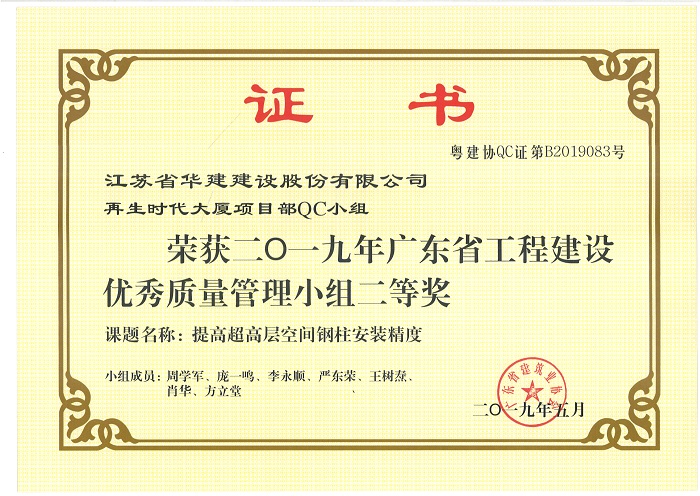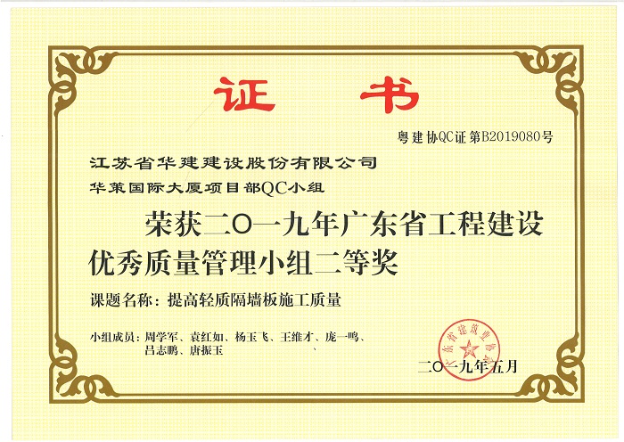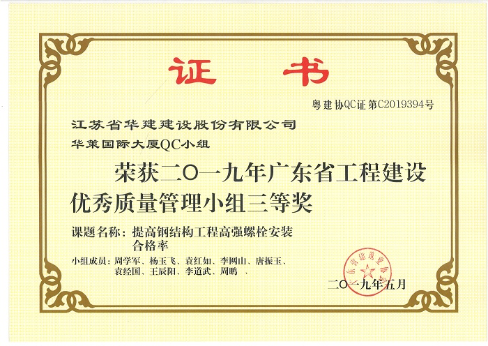 公司新添4項省級工程建設優秀QC成果 時間:2019-07-11 3951 近期,廣東省建筑業協會發文公布了2019年度廣東省工程建設優秀質量管理小組名單,公司華策國際大廈項目部QC小組“提高輕質隔墻板施工質量”、再生時代項目部QC小組“提高超高層空間鋼柱安裝精度”兩項成果喜獲二等獎,華策國際大廈項目部QC小組“提高鋼結構工程高強螺栓安裝合格率”榮獲三等獎。 華策國際大廈項目部QC小組“設備機房減振降噪的創新方法”成果在江蘇省建筑業協會組織的2019年度江蘇省工程建設質量管理小組活動中榮獲二等獎。