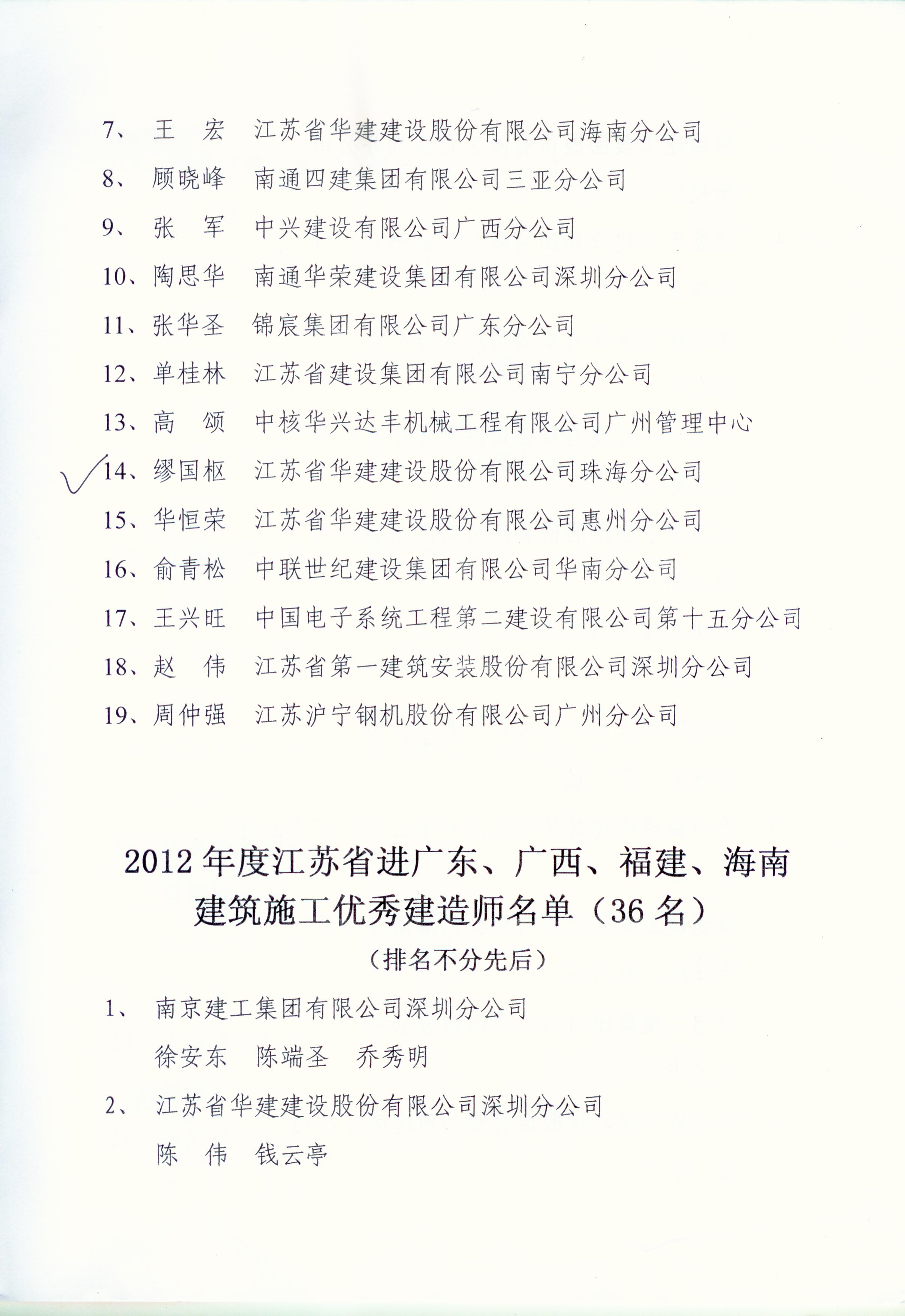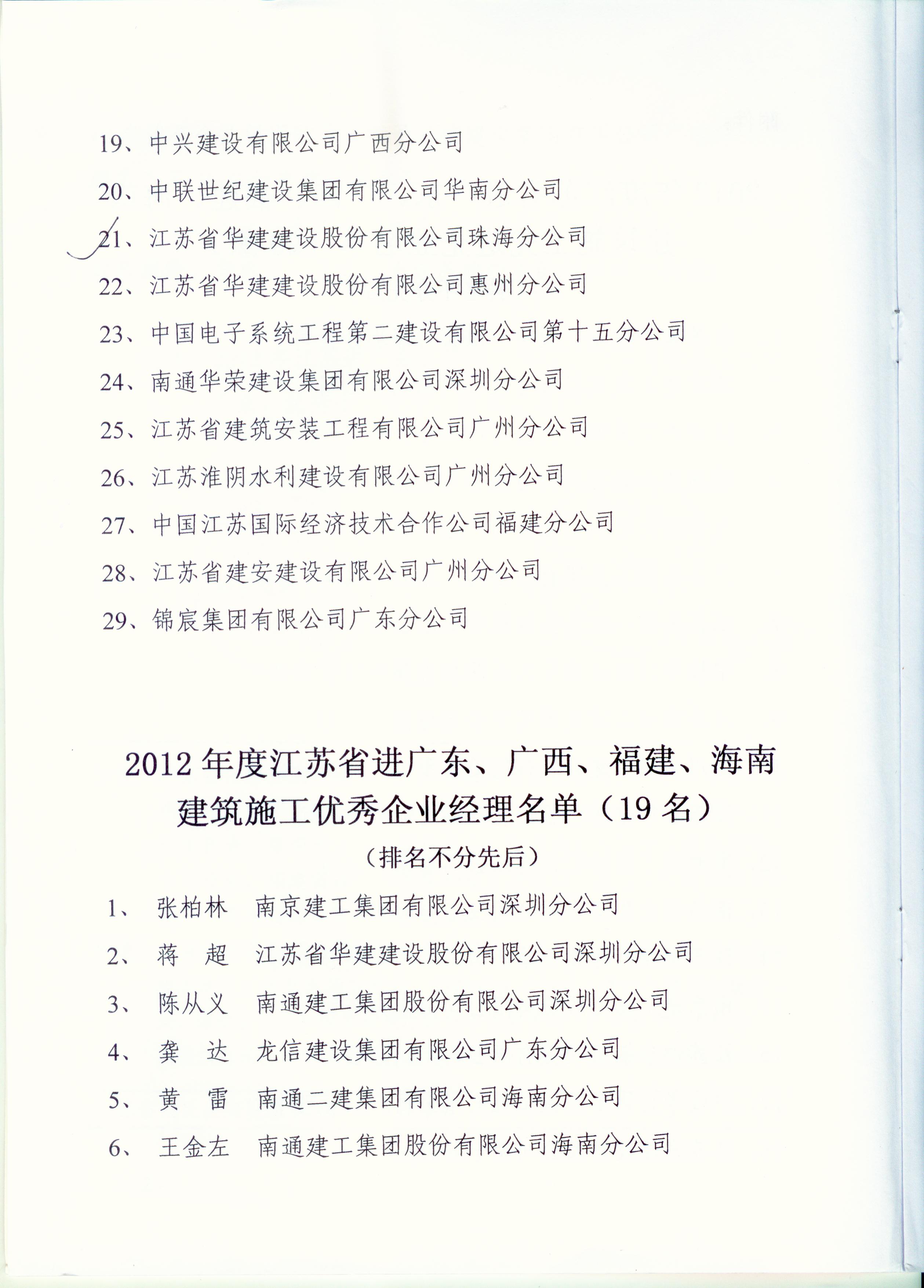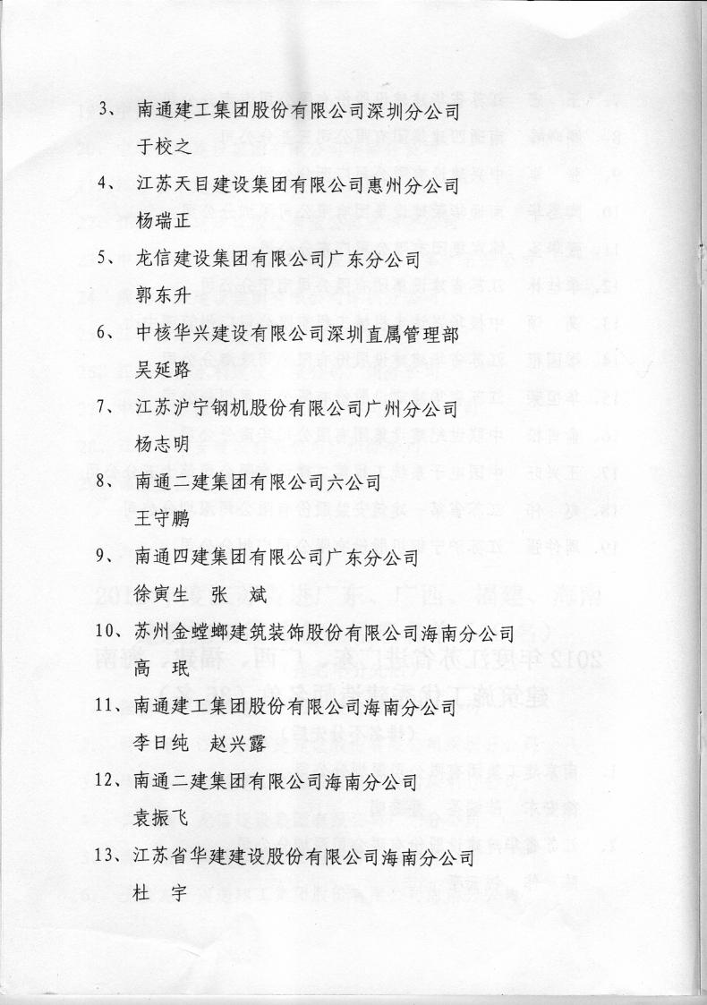 2012年江蘇進粵、桂、閩、瓊建筑施工先進企業、優秀企業經理、優秀建造師及經營財務管理、質量安全管理先進個人
